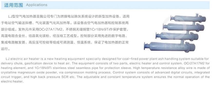 LJ型空氣(qi)電加熱器(qi)是我公司(si)專門爲燃(ran)煤電站除(chu)灰系統設(she)計的新型(xing)加熱設備(bei),适用于電(dian)站空氣輸(shu)送斜槽、氣(qi)化裝置氣(qi)化風加熱(re)等。該設備(bei)由空氣電(dian)加熱器和(he)控制系統(tong)兩部分組(zu)成