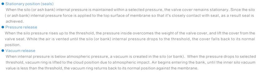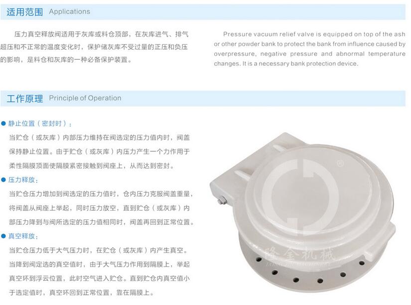 壓力(li)真空(kong)釋放(fang)閥适(shi)用于(yu)灰庫(ku)或料(liao)倉頂(ding)部,在(zai)灰庫(ku)👋進氣(qi)、排氣(qi)超壓(ya)和不(bu)正常(chang)的溫(wen)度變(bian)化時(shi),保護(hu)儲灰(hui)庫不(bu)受過(guo)皿的(de)正壓(ya)和負(fu)壓的(de)影響(xiang),是料(liao)倉和(he)灰庫(ku)的一(yi)種必(bi)備保(bao)🏃🏻♀️護裝(zhuang)置。